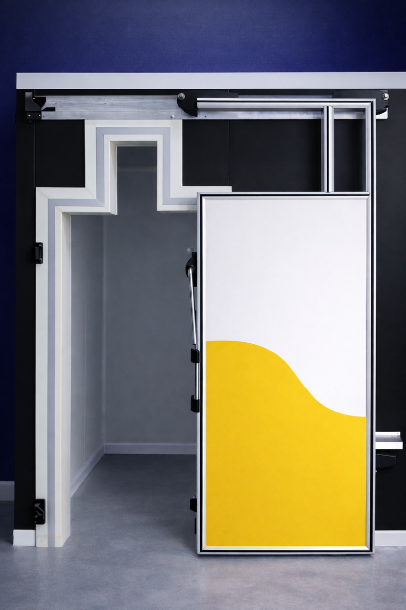 Les portes isothermes coulissantes avec passage de rail SWL 300 , sont constituées des éléments principaux: A - Cadre standard en matériel PVC de couleur blanc renforcé à l'intérieur en acier. B - Vantail standard constitué d’un panneau sandwich en tôle laquée isolé, cadre perimétral en aluminium anodisé le long du quel est logé le joint d’étanchéité. Épaisseur : 80mm (SWL 300) pour températures positives. 100 à 120mm (SWL300) pour températures négatives . UTILISATION : Conçue pour chambres froides de conservation et transformation des aliments à température positive (0°C minimum). Utilisée dans les boucheries ou dans les abattoirs.